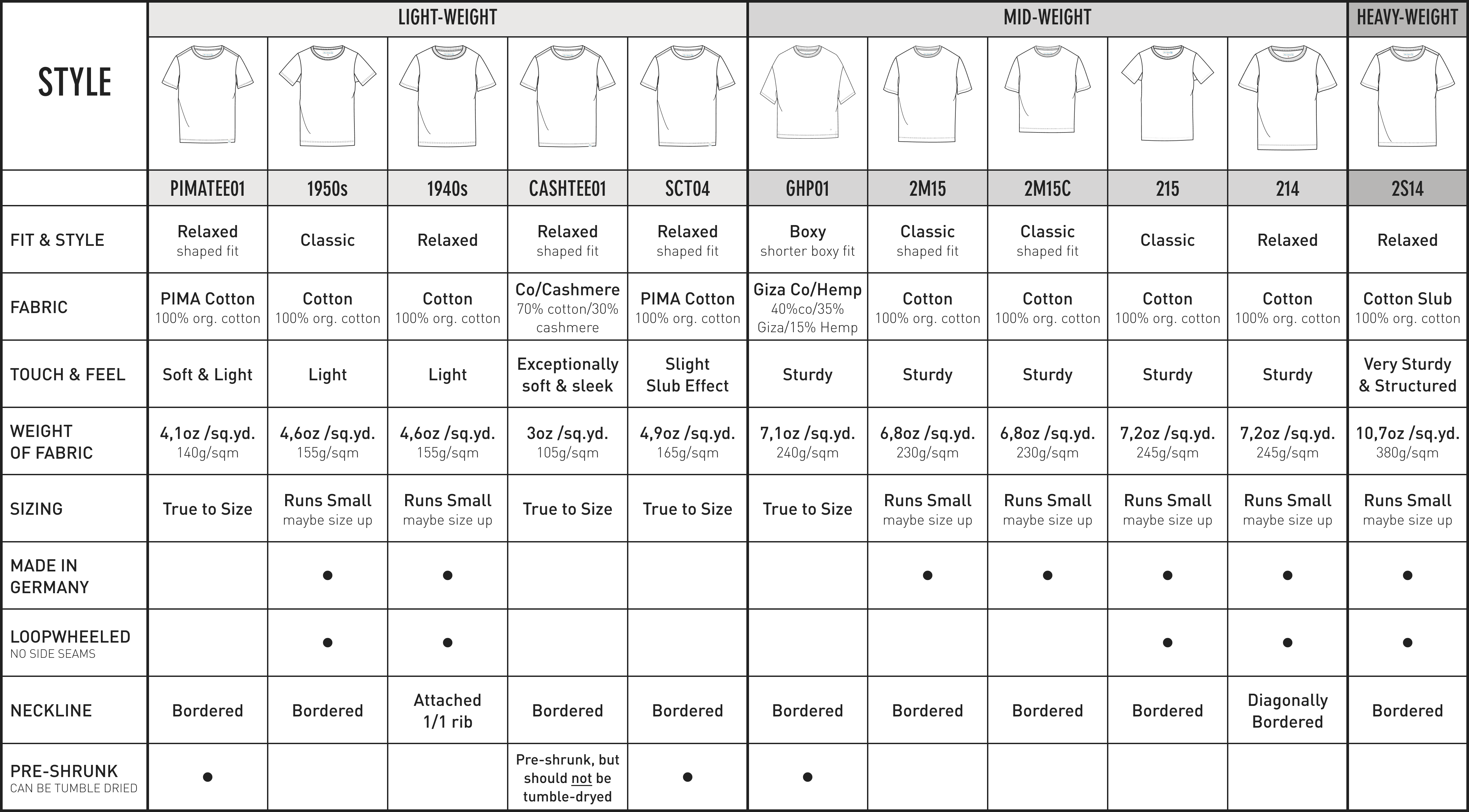 Welcome to our T-shirt guide! Explore our diverse range of T-shirts, thoughtfully categorized by fabric weight to help you find your ideal match.