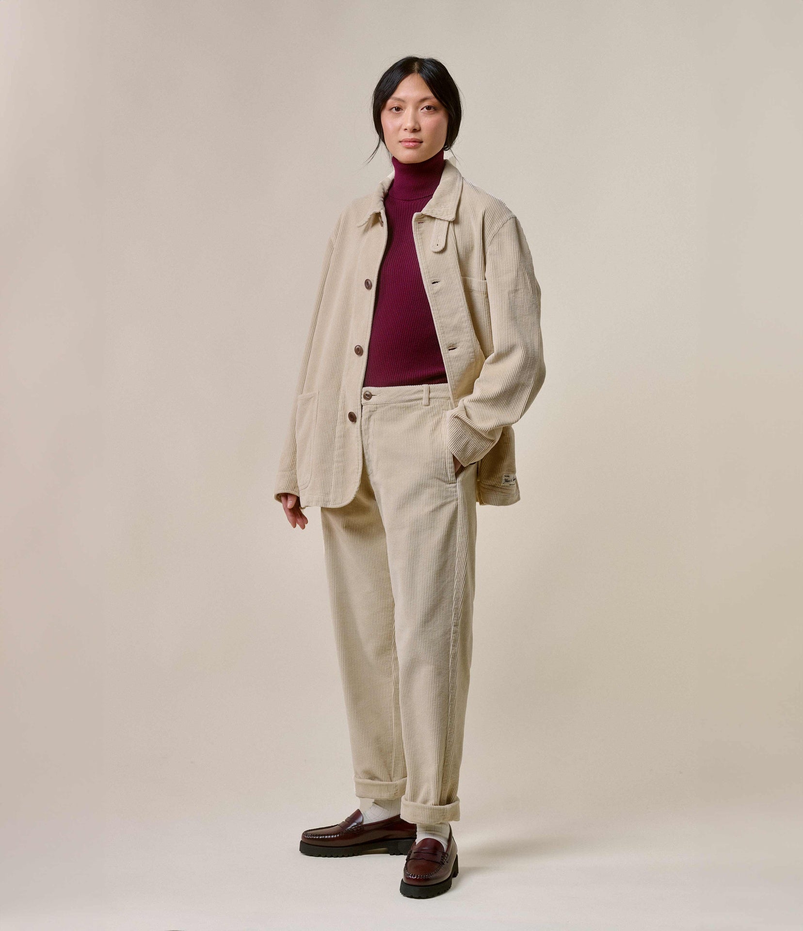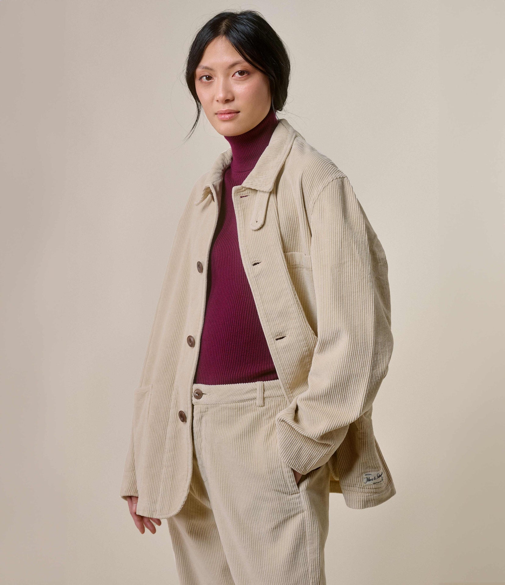 Our classic Merz b. Schwanen jacket has been given the corduroy treatment for autumn. Made with 100% organic cotton, this sturdy and comfortable garment is styled with three outer pockets, one inside pocket, vegan corozo fish-eye buttons, and triangle under-arm inserts.
