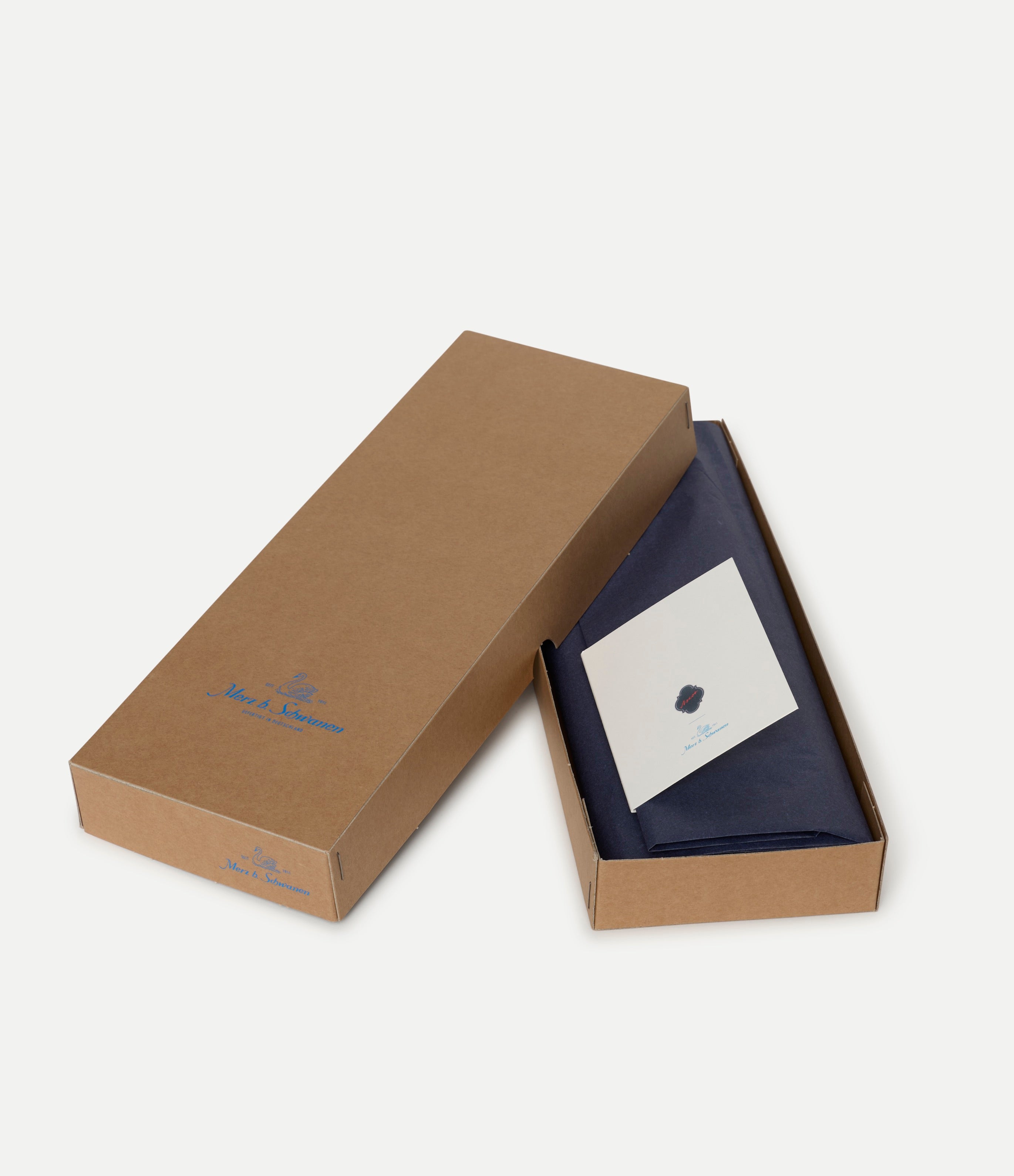 Auch unsere maßgefertigte Verpackung wurde mit derselben Sorgfalt gestaltet. Wie die Krawatte selbst wird jede Box in Deutschland von Hand gefertigt. Die Krawatte wird anschließend per Hand in Papier eingeschlagen und verpackt.