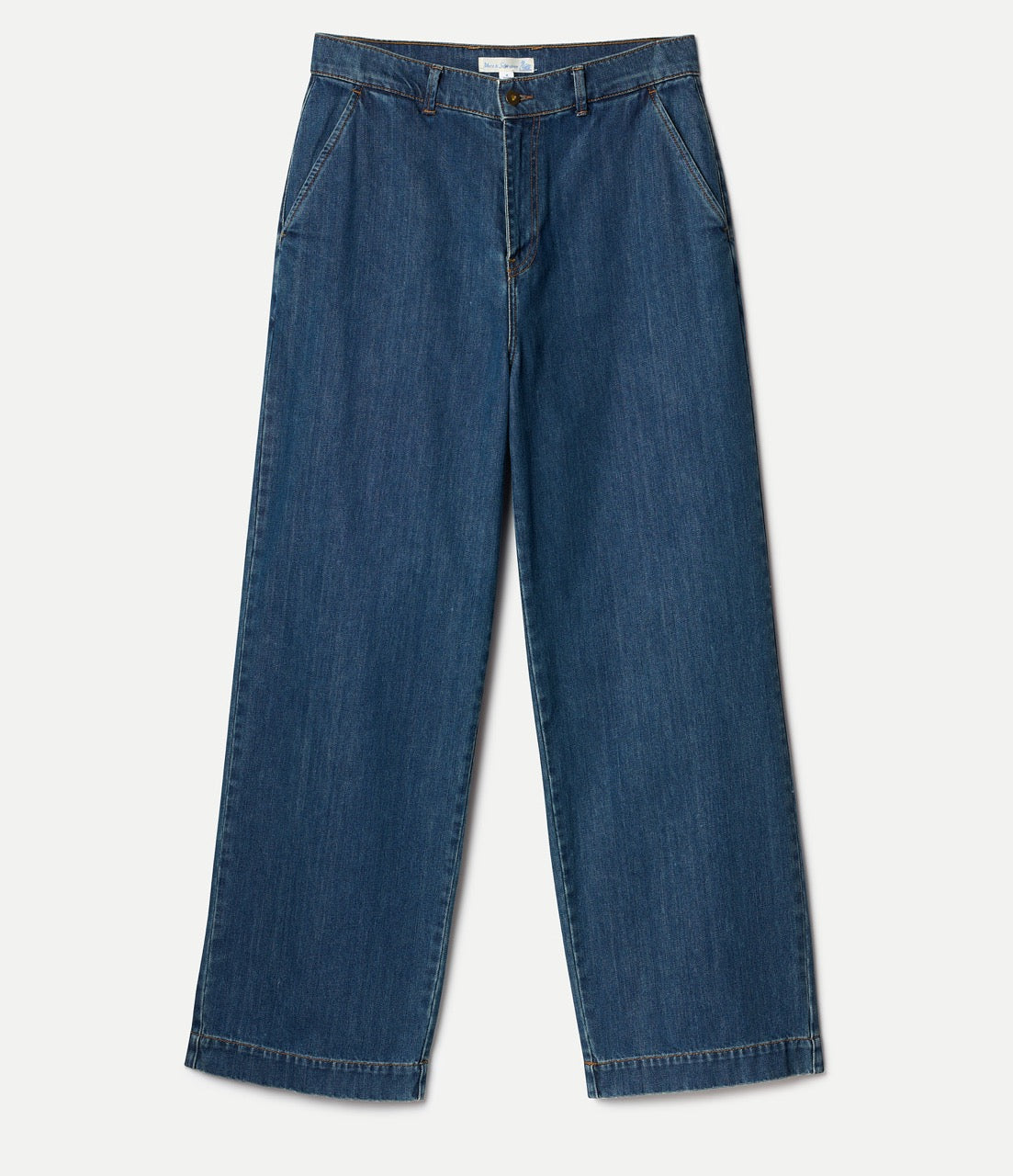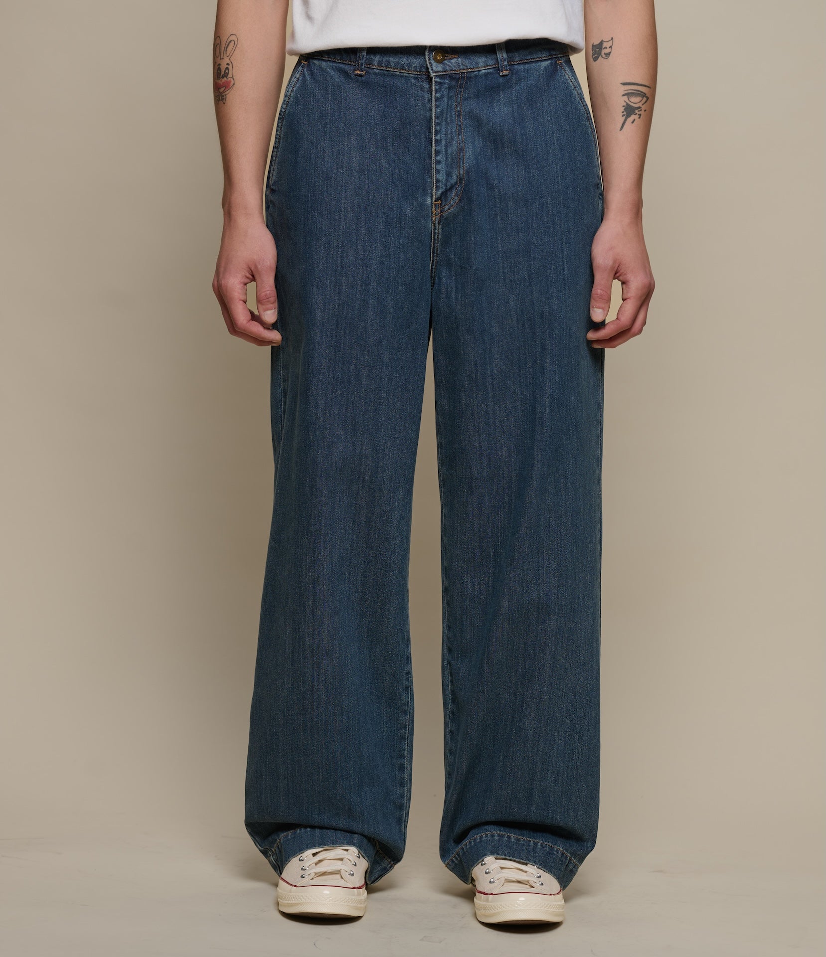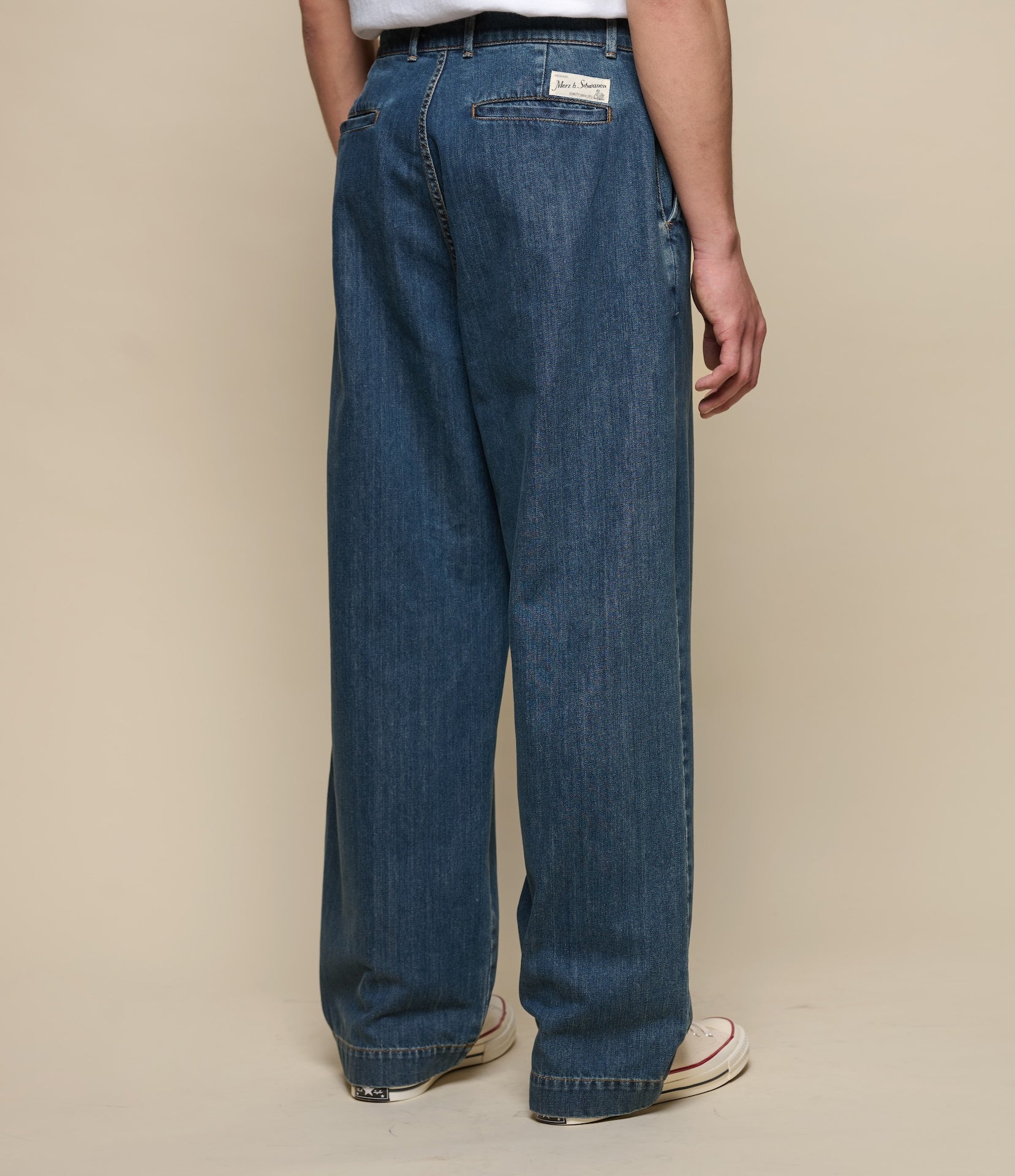 Designed with a high-rise, wide-leg fit, and full button closure, they feature angled side pockets and back welt pockets with corozo nut button closures. A modern silhouette rooted in utilitarian tradition.