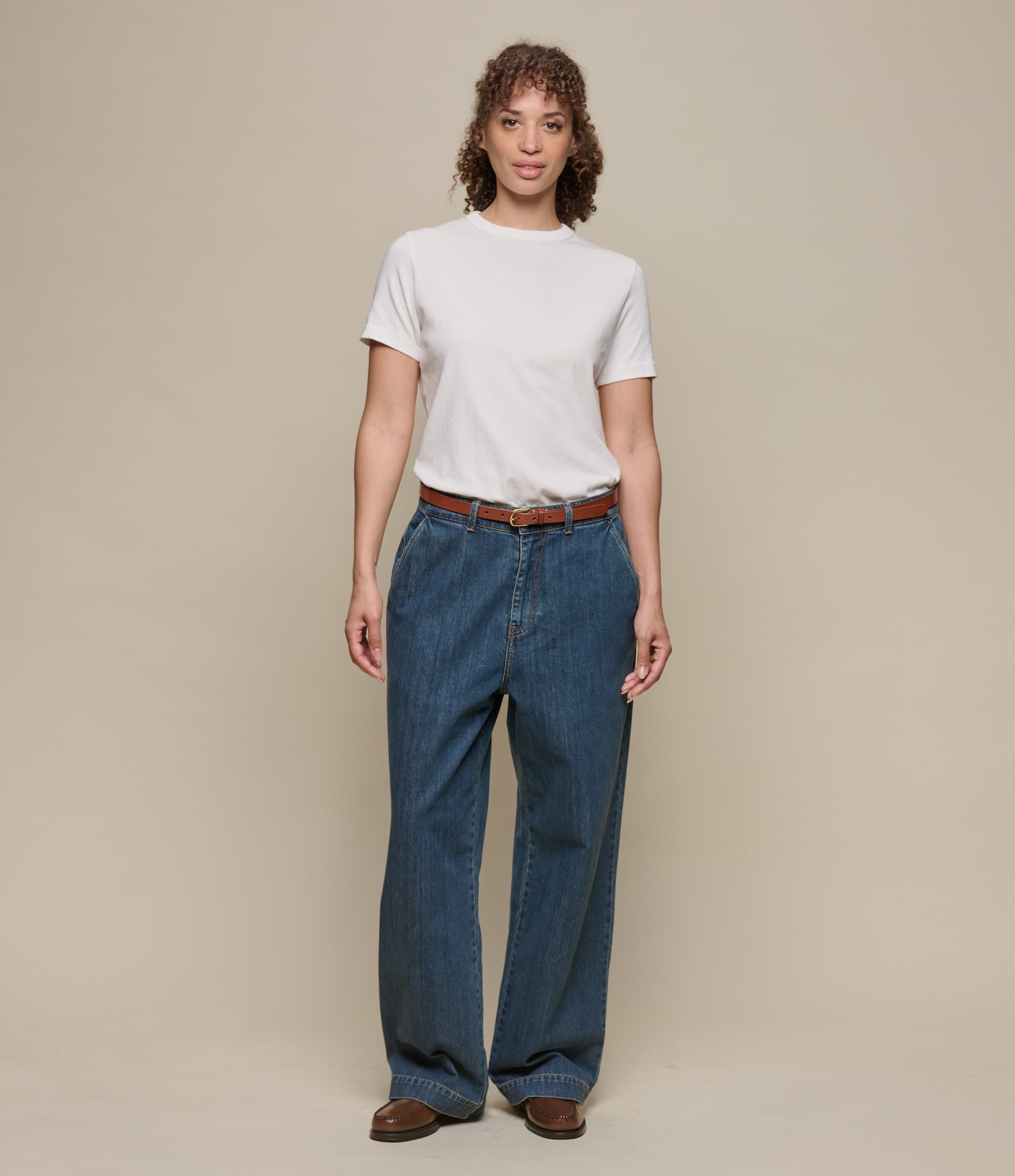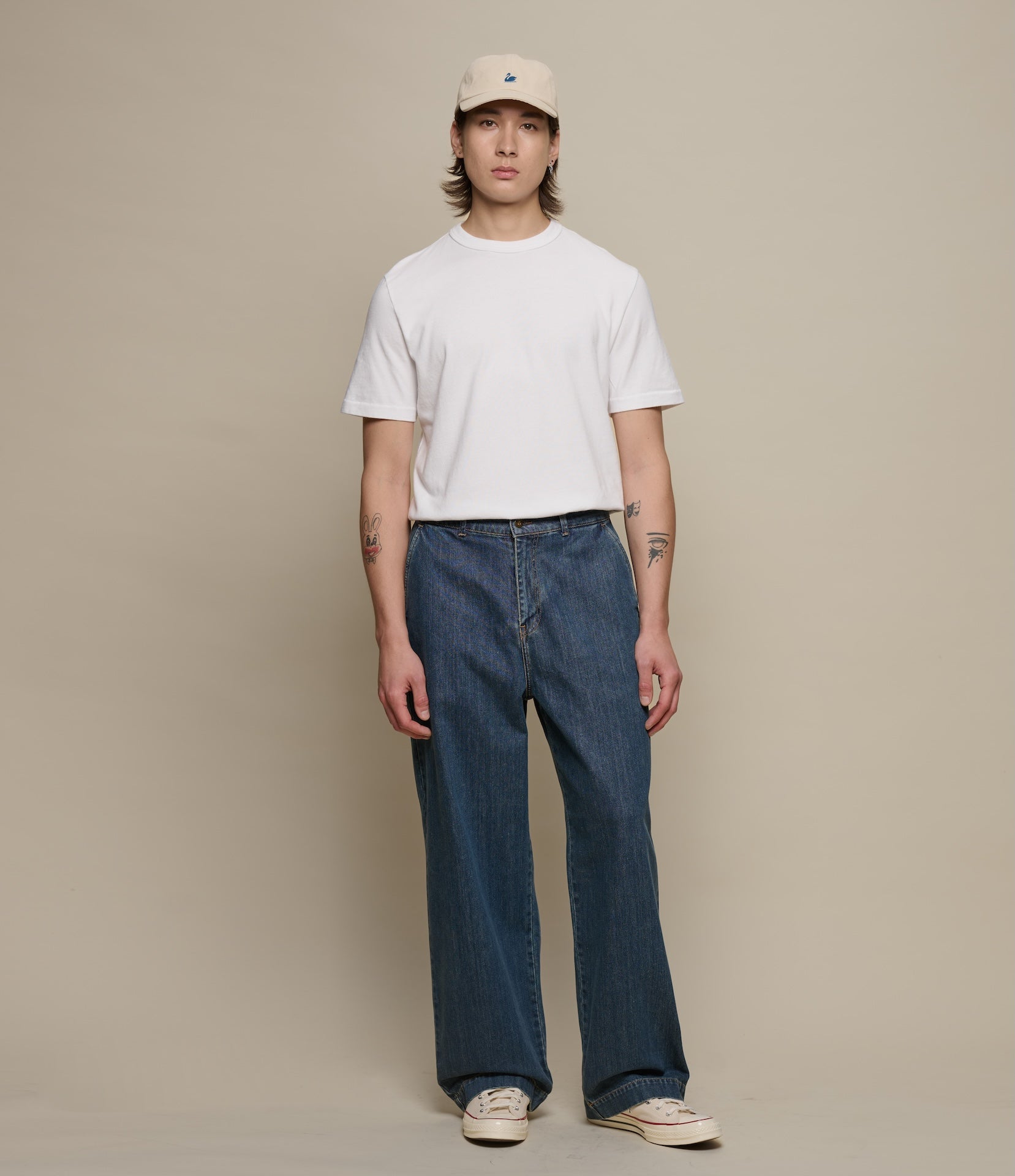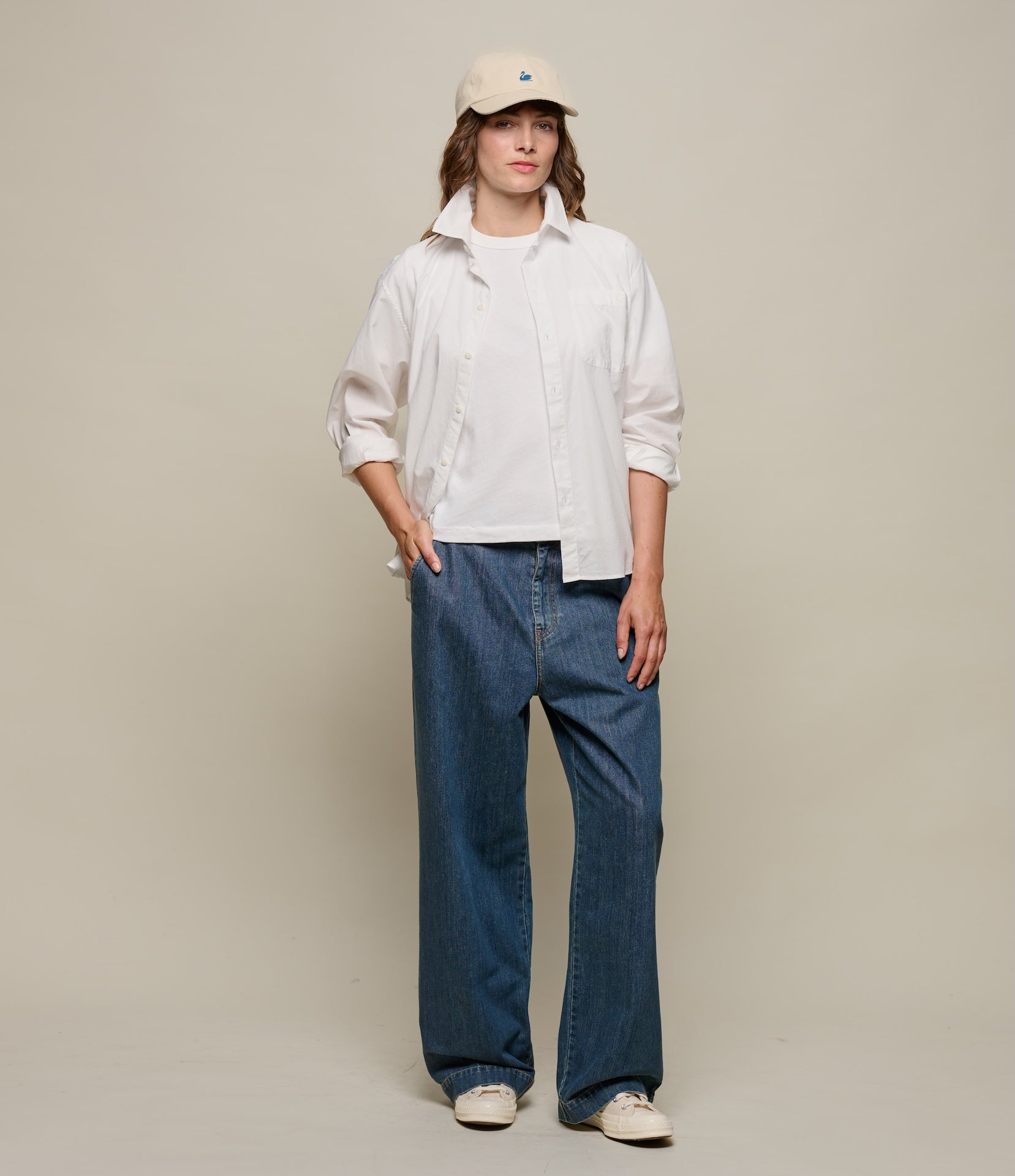 Designed with a high-rise, wide-leg fit, and full button closure, they feature angled side pockets and back welt pockets with corozo nut button closures. A modern silhouette rooted in utilitarian tradition.