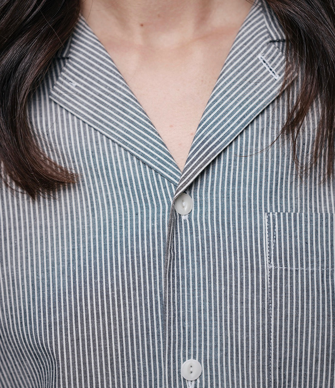 Sleep well, dream big – and feel and look even better thanks to your new favorite pyjama! Made of all-organic cotton and assuring easy movement at night (and day) thanks to its relaxed cut and wide-leg pants, this new pyjama checks all the boxes for a soothing sleep. And the look? By blending traditional details such as the striped chambray optic with more modern touches like attached pockets and vegan corozo buttons, this cool piece might even be tempting you to wear it out. So while you surely got your favorite pieces for every day, now you also got one for every night!