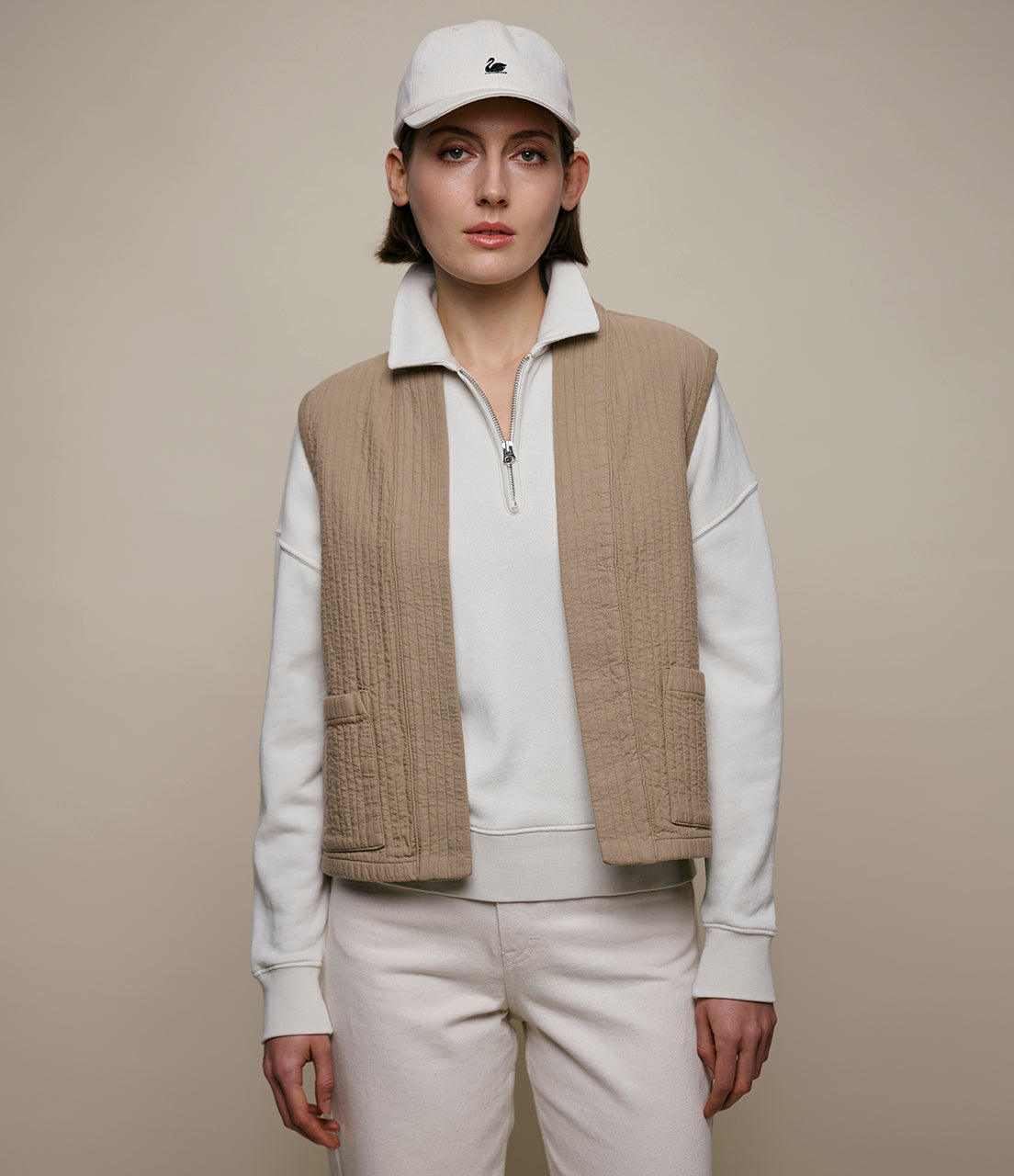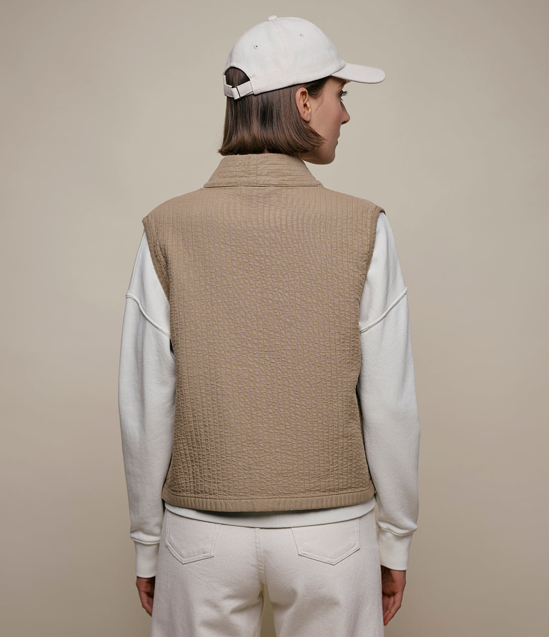 Add an extra layer of warmth with our Padded Vest. Made from 100% organic cotton padded fabric, this vest is perfect as an extra layer that adds structure and versatility to any look. What sets this fabric apart is its unique two-layer weave, crafted entirely from cotton—eliminating the need for a polyester filling in the middle. This innovative approach enhances comfort and underscores our commitment to sustainable design.