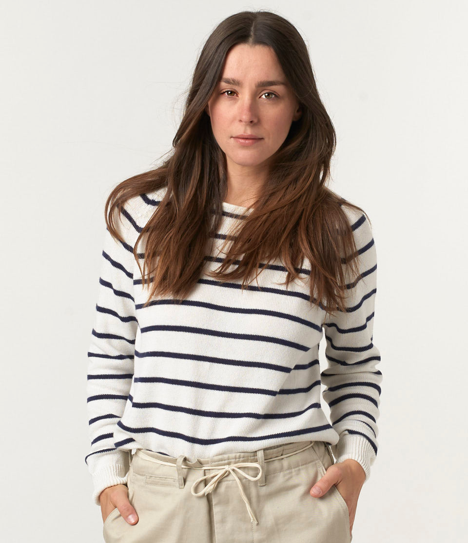 Wishing for this all-time favorite light pullover to put on chilly summer days or evenings This cool pullover made of a wonderfully soft and airy cotton-cashmere blend is just right! The easy-going stripes and subtle colors grant immediate summer vibes. Its cropped fit adds to this casual look. Thanks to its gentle material blend, this piece is super-light and incredibly pleasant on your skin. The benefit of cashmere? It makes the pullover very soft, yet durable and flexible, so it holds its shape well over time, allowing you to enjoy a lot of summer evenings for a long time to come.