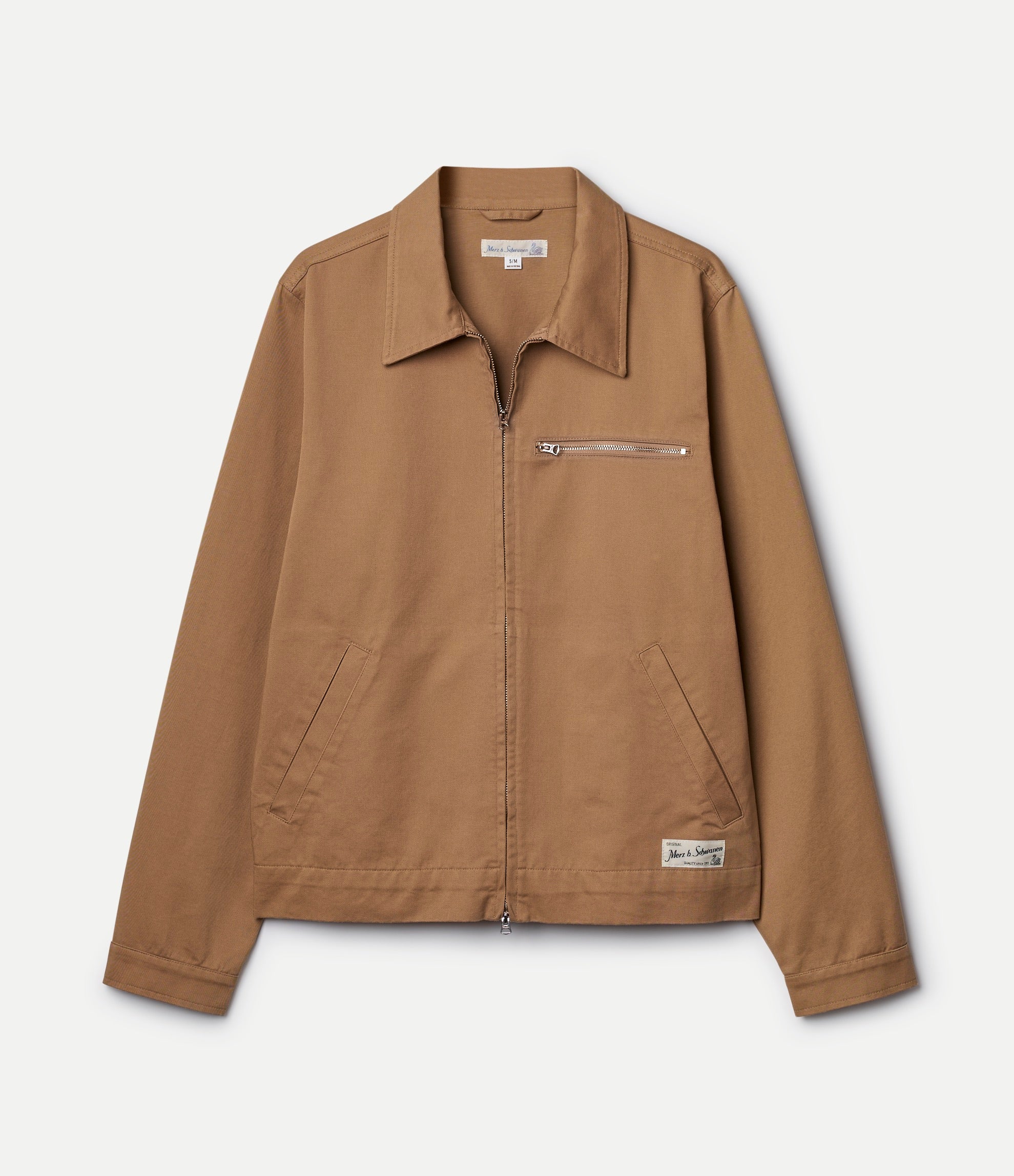 This durable, work-wear-inspired jacket with a relaxed yet cropped fit is unmistakably Merz b. Schwanen. A nice twist on an iconic silhouette, this jacket has a two-way zip closure for versatility, with zipped side pockets and a zipped breast pocket for added utility.